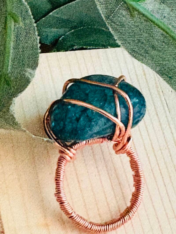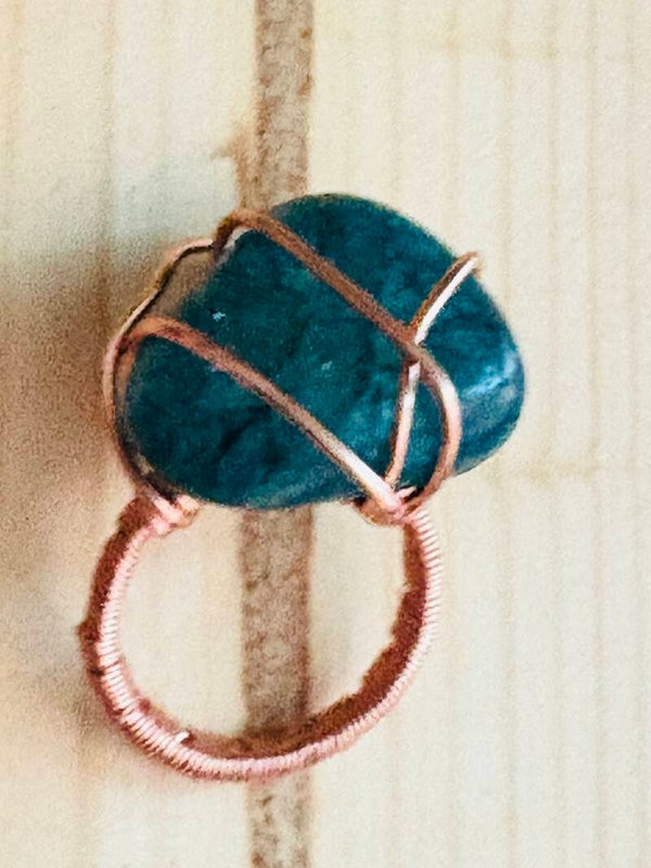 Ground your energy in style with this handcrafted copper wire-wrapped green agate ring. Known for its calming and protective properties, green agate promotes emotional balance, courage, and harmony—while the copper amplifies its healing energy. A bold piece with powerful benefits.